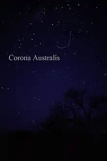 Constelația Coroana Australă văzută cu ochiul liber. Pentru identificarea mai ușoară au fost trasate linii între stele.