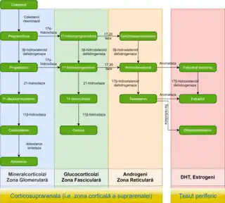 - Progesteron → (hidroxilare la C17) → 17-alfa-hidroxiprogesteron → (hidroxilare la C21) → 11-Deoxicortizol → (hidroxilare la C11) → Cortizol