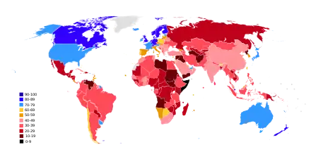 O hartă mondială a nivelului de corupție, măsurat conform Indicelui de Percepție a Corupției 2017 de către Transparency International. Tarile colorate în albastru înregistrează un nivel scăzut de corupție, iar cele în roșu înregistrează un nivel ridicat de corupție.