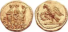 Reversul pare similar cu un denar, în acest caz argint, emis în anul 54 î.Hr. de Marcus Junius Brutus , înfățișând o procesiune deschisă de un accent urmat de trei figuri masculine. Totuși, în cazul monedelor cu legenda ΚΟΣΩΝ , există doar trei figuri masculine togate care merg spre stânga: