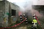 Exercițiu pompieri la stingerea incendiului unei case și echipați cu costum de protecție