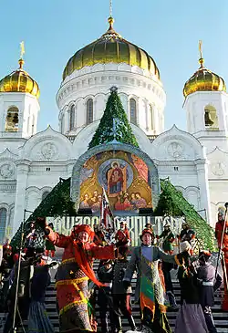 ![]() Oameni sărbătorind Crăciunul în fața Catedralei Hristos Mântuitorul din Moscova, 2002 | |