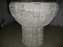 Cristelnița din Redecilla del Camino, Spania (sec. al XII-lea). Relieful cupei, reprezentând Ierusalimul ceresc, se sprijină pe un pilon octogonal, cu trimitere la a opta zi a Facerii Lumii
