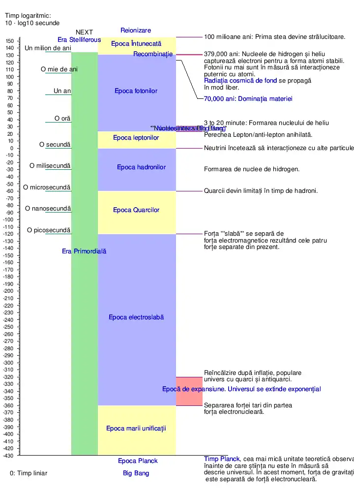 Aceasta este o prezentare grafică a Big Bang-ului care arată succesiunea de evenimente prevăzute de teoria Big Bang-ului de la începutul timpului până la epoca întunecată.
