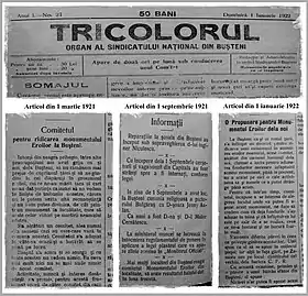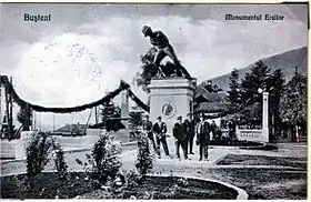„... Întorși de neagra pribegie, între alte preocupațiuni am avut grijă ca și noi, dela Bușteni, să nu rămânem mai prejos de cuprinsul țărei și să ne gândim la cei dispăruți în groaznicul război, cei ce ne-am mărit țara și cari ne-au dat putința ca iarăși să ne vedem în liniște de treburile noastre, cărora nu le putem arăta altă recunoștință și nu i-am putea diviniza, de cât printr-un monument în localitate, care să arate celor viitori pe martirii neamului nostru. S-a alcătuit un comitet, ales numai din oameni cari au oarecare vază în comuna noastră. Comitetul s-a adunat în câteva ocazii și a hotărât să se pună pe lucru. Timpul s-a scurs și se scurge și cu toate acestea nu vedem nimic. Ba ceva mai mult nici nu se mai aude nimic de acest comitet. Activitate, muncă și interes desăvârșit s-a promis, pentru această frumoasă operă de către comitet, din care toate nu vedem nimic. În comunele din jurul nostru, care au astfel de comitete alcătuite tot pentru acest frumos scop, au lucrat ceva și oricând o pot dovedi prin sumele de bani ce au strâns. Dar la noi nu vedem nimic. Pentru ca să scăpăm de ponosul că, noi, cei din Bușteni, suferim de boala constituirei de comitete cu fel de fel de inițiative, cari nici unele nu au dat rezultate, bine ar fi ca D-nii cari constituesc comitetul pentru ridicarea Monumentului Eroilor din Bușteni să ne dea o lămurire cam unde au ajuns cu activitatea.”[40]