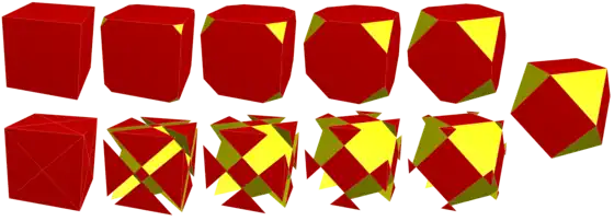 Dacă porțiunile autointersectate ale octagramelor sunt îndepărtate, lăsând pătratele și trunchiind triunghiurile în hexagoane, se produc octaedre trunchiate, iar secvența se termină cu pătratele centrale reduse la un punct și creând un octaedru.