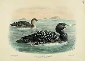 Cufundarul cu cioc alb după H. E. Dresser. În față pasărea adultă în penajul nupțial (vara), în spate pasărea adultă în penajul postnupțial (iarna).[15]