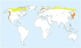 Arealul cufundarului cu cioc alb      Locurile de cuibărit      Cartierele de iarnă