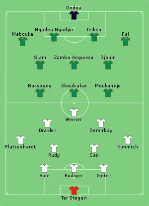 22 iunie 2017 . Arhivat din original la27 martie 2019 . Accesat în22 iunie 2017 . - „Tactical Line-up – Group B – Germany - Cameroon” (PDF). FIFA.com. Fédération Internationale de Football Association.