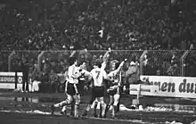 Frank Lippmann celebrates scoring Dresden's first goal against Uerdingen, with (L-R) Jörg Stübner, Matthias Döschner and Andreas Trautmann