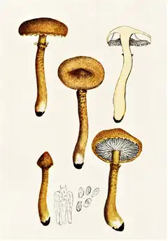- Petter Adolf Karsten: „Lepiota amianthina” în: „Bidrag till Kännedom av Finlands Natur och Folk”, vol. 32, 1879, p. 15