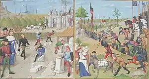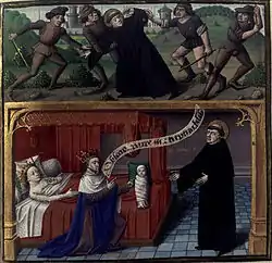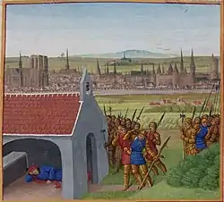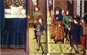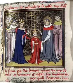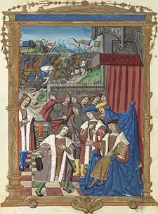 - Les Grandes Chroniques de France sunt o cronică medievală prestigioasă, adesea ilustrată, care retrasează istoria regatului Franței în franceza veche, adunată pentru prima dată la cererea regelui Ludovic al IX-lea (1214-1270) și ulterior extinsă în ediții actualizate până în 1461. Inițiativa acestei cronici se datorează Sfântului Ludovic (ceea ce istoricul Bernard Guenée contestă[89]), care dorea ca istoria transmisă a francilor (de la originea lor mitică troiană, marcată în mod deosebit de Cronica Sfântului Denis care avansase deja această teză) să fie conservată și mai bine cunoscută.