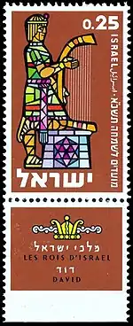 David, erou, rege, poet și muzician, pe o marcă poștală israeliană din anul 1960