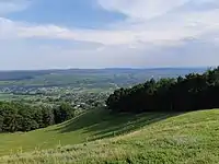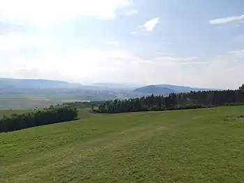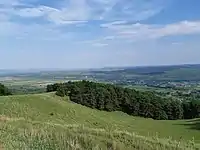 ![]() Dealul Boiștea (în plan îndepărtat). Perspectivă sudică de pe Dealul Ghindăului, situat în apropierea Șeii Crăcăoani | |