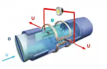 Debitmetrul electromagnetic permite măsurarea debitului de curgere al unui fuid în mișcare folosindu-se principiul inducției electromagnetice. Conform acestui principiu, descoperit de Faraday, într-un mediu fluid electric conductiv care se mișcă într-un câmp magnetic, ia naștere o forță motrică electrică (f.e.m.) dependentă de intensitatea câmpului magnetic și de viteza fluidului.[1] Deci concret este măsurată viteza fluidului prin o secțiune cunoscută, rezultând logic debitul de curgere. Este un debitmetru frecvent folosit, fiind al treilea ca utilizare după debitmetrele cu piese mobile.