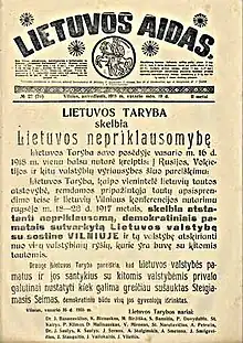 În 1915, Germania a ocupat regiunile vestice ale Imperiului Rus. După Revoluția Rusă din 1917, Germania a conceput strategia geopolitică Mitteleuropa — o rețea regională de state-marionetă care aveau să servească drept zonă-tampon — și au acceptat să permită desfășurarea Conferinței de la Vilnius, în speranța că ea va proclama separarea națiunii lituaniene de Rusia și stabilirea de relații mai apropiate cu Germania.[1] Această strategie s-a întors, însă, împotriva lor; conferința, ținută între 18–22 septembrie 1917, a adoptat o rezoluție de înființare a unei Lituanii independente și că strângerea relațiilor cu Germania va fi condiționată de recunoașterea noului stat de către aceasta.[7] La 21 septembrie, cei 214 participanți la conferință au ales un Consiliu al Lituaniei format din 20 de membri, cu scopul de a formaliza rezoluția.[8] Autoritățile germane nu au permis publicarea rezoluției, dar au lăsat Consiliul să funcționeze.[1] Conferința de la Vilnius a decis și alegerea unei adunări constituante prin vot popular în cel mai scurt timp.