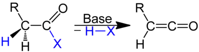 Reacția de dehidrohalogenare aplicată clorurilor de acil este utilizată pentru obținerea de cetene.[5] Reacția se poate face în prezență de trietilamină:
