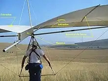 3. Termeni constructivi Anvergura reprezintă lungimea aripii măsurată între extremitățile aripii. Se notează cu litera b, anvergura are valoare constantă; Profunzimea este lățimea aripii măsurată între bordul de atac și bordul de fugă. Este variabilă în lungul anvergurii, valoarea maximă este în dreptul chilei, pe centrul aripii deltaplanului; Capătul aripii reprezintă extremitatea aripii și este locul unde voalura se prinde la bord prin intermediul unui șurub inox de 6 mm; Lobi - aripa deltaplanului este flexibilă, în zbor datorită forței de portanță (distribuită pe aripa) se deformează. Deltaplanele de școală au lobii mai mari pentru a fi mai stabile în zbor; Bord de atac este partea din fata a deltaplanului, format din țeava bordului care trece prin voalură; Bord de fugă este partea din spate a voalurii deltaplanului; Unghi la nas este unghiul format de țevile bordului la îmbinarea din nas. La deltaplanele de școală este de aproximativ 90 grade sau puțin mai mult. La deltaplanele de performanță poate ajunge la 130 grade.