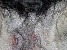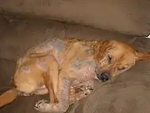 Demodicoza canină, numită și râia roșie sau râia demodecică[5], este provocată de Demodex canis, care se transmite în cadrul speciei de la cățeaua care alăptează la puii săi, afectând în special animalele tinere[6] (3-12 luni). Nu este transmisibilă la om.