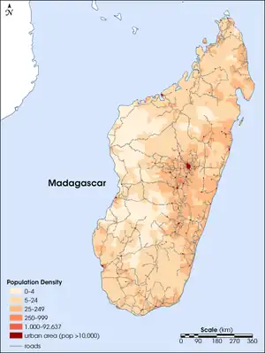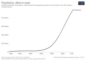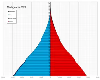 Problema cu estimarea populației în Madagascar este că datele sunt foarte vechi și limitate. Ultimul recensământ al populației a fost efectuat în 1993, după un recensământ inițial din 1975. A existat o încercare de recensământ în 2009, dar această încercare a eșuat în cele din urmă din cauza instabilității politice. Prin urmare, situația demografică este dedusă, dar fiabilitatea oricăror estimări din orice sursă are o marjă mare de eroare. Conform Format:UN Population populația totală era Format:UN Population în Format:UN Population, comparativ cu doar 4.084.000 în 1950. Proporția copiilor sub vârsta de 15 ani în 2010 a fost de 43,1%, 53,8% a fost între 15 și 65 de ani, în timp ce 3,1% a fost de 65 de ani sau mai mult.[1]