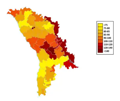 | Găgăuzi | 55.790 | 2,88 | 98.172 | 3,43 | 115.683 | 4,23 | 95.856 | 3,32 | 124.902 | 3,50 | 138.000 | 3,49 | 153.458 | 3,54 | 147.500 | 4,38 | 126.010 | 4,57 |
