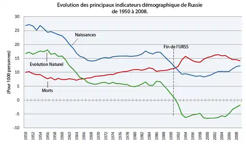 Populația din Federația Rusă a atins numărul de 148.689.000 în 1991, chiar înainte de destrămarea Uniunii Sovietice. După aceasta s-a înregistrata un declin rapid la mijlocul anilor '90. Declinul a încetinit, ajungând la stagnare, în ultimii ani datorită ratelor de deces reduse, creșterii ratei natalității și cresterii imigranției. Numărul de decese în cursul anului 2008 a fost cu 363.500 mai mare decât numărul de nașteri. Acest număr este în scădere de la 477.700 în 2007, și 687.100 în 2006. Potrivit datelor publicate de Direcția de Statistică a statului federal rus, rata mortalității în Rusia a scăzut cu 4% în 2007, față de 2006, ajungând la aproximativ 2 milioane de decese, în timp ce rata natalității a crescut cu 8,3% de la an la an la o valoare estimată de 1.6 milioane de nou-născuți.
