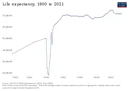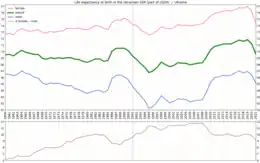 Foametea din anii 1930, urmată de devastările celui de-al Doilea Război Mondial, au creat un dezastru demografic. Speranța de viață la naștere a scăzut la un nivel de până la 10 ani pentru femei și 7 pentru bărbați în 1933 și a crescut până în jurul valorii de 25 de ani pentru femei și 15 ani pentru bărbați în perioada 1941-1944.[10] Potrivit The Oxford companion to World War II, „Peste 7 milioane de locuitori ai Ucrainei, mai mult de o șesime din populația de dinainte de război, au fost uciși în timpul celui de-al Doilea Război Mondial”.[11]