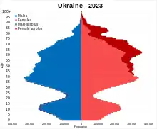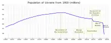 Serviciul de Stat de Statistică al Ucrainei a estimat populația totală a țării (cu excepția Crimeei) la 1 ianuarie 2022 la aproximativ 41 de milioane. În timpul războiului din Donbas, guvernul ucrainean a pierdut controlul unor porțiuni din regiunea Donbas. În plus, din cauza invaziei ruse din 2022, mai mult de 8 milioane de ucraineni au fugit din țară într-o criză a refugiaților.[4]