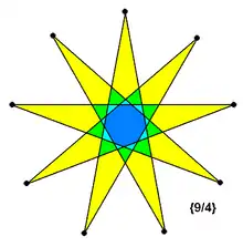 La un poligon stelat regulat {p/q}, densitatea este q. Poate fi determinată vizual prin numărarea numărului minim de traversări ale laturilor de către o semidreaptă cu originea în centru.