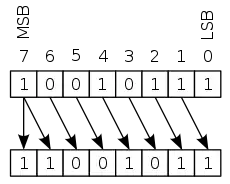 BitsaData.Bitsdin modulul Haskell definește atâtshiftpentru un argument cu semn, cât șishiftL/shiftRpentru argumente fără semn. Acestea sunt izomorfe; pentru definiții noi, programatorul trebuie să furnizeze doar una dintre cele două forme, iar cealaltă formă va fi definită automat în funcție de cea furnizată. - Operatorul de deplasare stânga aritmetică VHDL este neobișnuit. În loc să umple bitul cel mai puțin semnificativ cu 0, acesta copiază acolo bitul original. În timp ce aceasta este o imagine exactă în oglindă a deplasării aritmetice la dreapta, nu este definiția convențională a operatorului și nu este echivalentă cu înmulțirea cu o putere a lui 2. În standardul VHDL 2008, acest comportament ciudat a fost lăsat neschimbat (pentru compatibilitate „în jos”) pentru tipurile de argumente care nu au interpretare numerică forțată (de exemplu, BIT_VECTOR), dar „SLA” pentru tipurile de argument su semn (în engleză unsigned) și fără semn (în engleză signed) se comportă în modul așteptat (adică, pozițiile din dreapta sunt umplute cu zerouri). Funcția logică de deplasare stânga (SLL) a lui VHDL implementează schimbarea aritmetică „standard” menționată mai sus.