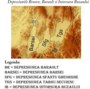 ![]() Depresiunea Întorsura Buzăului în raport cu subdiviziunile depresiunii Brașovului, și Depresiunea Baraolt | |