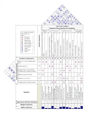 Matricea utilizează itemuri specifice pentru a înregistra prioritățile alocate cerințelor tehnice. Rezultatul final al matricei este un set de valori-țintă pentru fiecare cerință tehnică de satisfăcut în noul proiect.