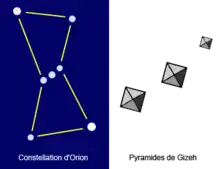 Corelația Orion este propusă de unii egiptologi (ca Selim Hassan) sau arheo-astronomi (ca Robert Bauval).[7] Conform acesteia există o corelație între poziția piramidele din Egipt și poziția stelelor, mai ales între cele trei piramide de la Giza (Piramida lui Keops, Chephren, și Piramida lui Menkaure) și cele trei stele centrale alee constelației Orion (δ Orionis, ε Orionis et ζ Orionis) .