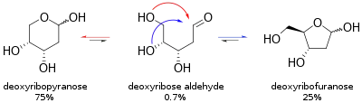 În soluție apoasă, dezoxiriboza există în mare parte ca un amestec de trei forme structurale: forma liniară, H−(C=O)−(CH2)−(CHOH)3−H și cele două forme ciclice, dezoxiribofuranoza ("C3′-endo", ciclu pentaatomic) și dezoxiribopiranoza ("C2′-endo", ciclu hexaatomic). Cea din urmă formă este predominantă.