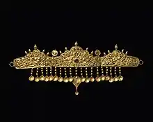 Diademă de aur grecească, confecționată probabil în Alexandria, Egipt, și aparținând unei femei aristocrate din dinastia Ptolemeilor (220–100 î.Hr.): clema are forma unui nod Herakles