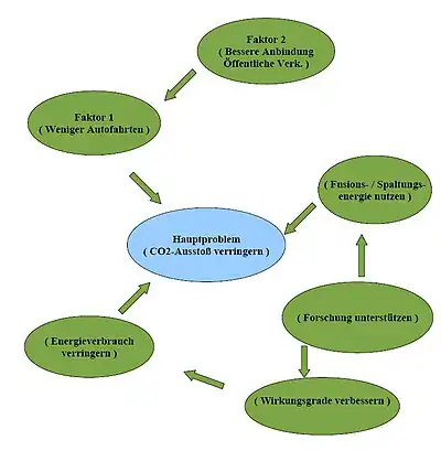 - identificarea cauzelor care fac ca problema respectivă să existe; fiecare dintre acestea poate fi efectul altor cauze; se stabilesc astfel legăturile "cauze-efect" principale; se trasează săgeți de la fiecare idee asupra problemei către cele pe care le cauzează sau le influențează;