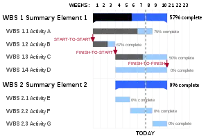 Diagrama cu legături conține linii care indică dependențele temporale dintre activități. În imaginea utilizată în acest articol, legăturile dintre activități sunt trasate cu linii roșii.