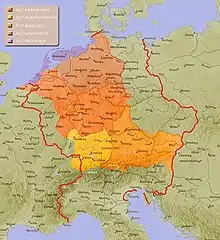 Teritoriile unde s-a vorbit limba germană veche pe cuprinsul Germaniei, Elveției și Austriei de astăzi (colorate în portocaliu pe această hartă)