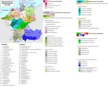Răspândirea geografică a limbii germane și a dialectelor limbii germane în Europa Centrală și de Est (în teal fiind marcate teritoriile tradiționale din sudul Transilvaniei populate și de sași, mai precis zonele județelor Sibiu și Brașov respectiv)