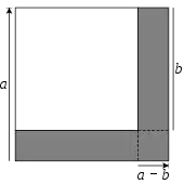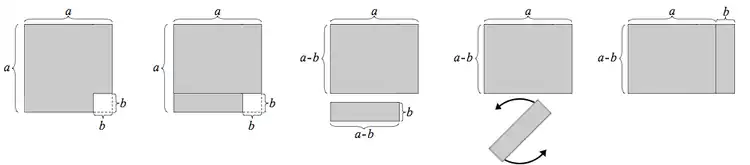 O altă demonstrație geometrică: se începe cu figura prezentată în prima imagine de mai jos, un pătrat mare cu un pătrat mai mic îndepărtat din el. Latura întregului pătrat este a, iar latura pătratului mic eliminat este b. Aria regiunii umbrite este . Se face o tăietură, împărțind regiunea în două părți dreptunghiulare, așa cum se arată în a doua figură. Piesa mai mare, în partea de sus, are lățimea a și înălțimea a−b. Piesa mai mică, de jos, are lățimea a−b și înălțimea b. Acum piesa mai mică poate fi detașată, rotită și plasată în dreapta piesei mai mari. În această nouă aranjare, prezentată în ultima imagine de mai jos, cele două piese formează împreună un dreptunghi, a cărui lățime este și a cărui înălțime este . Aria acestui dreptunghi este . Deoarece acest dreptunghi a venit din rearanjarea figurii originale, trebuie să aibă aceeași arie ca și figura originală. Prin urmare, .