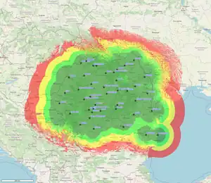 - 92,0 (regional) - releu Văcăreni pentru județele Brăila, Galați - municipiile Galați, Brăila și parțial județele Tulcea, Vrancea, municipiile Tulcea, Hârșova etc.