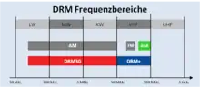 În anul 2005 a fost implementat proiectul DRM+ de extindere a sistemului DRM până la benzile de 300 MHz, iar în 2009 DRM + a devenit un standard oficial de distribuție. [2]