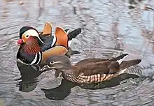 Dimorfismul sexual se poate manifesta la păsări în diferențe de mărime sau de penaj. Diferențele de mărime variază între specii, dar nu sunt regulă, în general păsările de pradă sau anumite specii de păsări nezburătoare nefiind diferențiate.[34] Diferențele de penaj, ca ornamentație sau culoare, de asemenea variază, dar în general masculii sunt mai ornamentați și prezintă culori mai vii.[35] Astfel de diferențe au fost atribuite contribuțiilor inegale din partea partenerilor sexuali.[36] În anumite specii, contribuția mascului se termină la sfârșitul copulării, în timp ce la alte specii mascului îngrijește urmașii. Diferitele forme de penaj au evoluat pentru a reflecta aceste diferențe și alte măsuri a valorii reproductive, cum ar fi condiția fizică[37] sau supravietuirea.[38] Fenotipul masculin trimite semnale femelei, care apoi alege cel mai „potrivit” mascul disponibil.