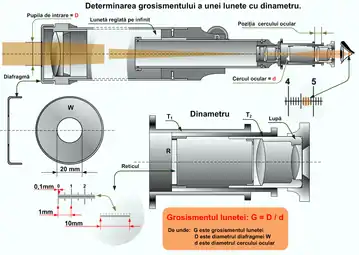 Se măsoară astfel diametrul d al cercului ocular. Cunoscând diametrul d al cercului ocular și diametrul D al pupilei de intrare (diametrul diafragmei W) grosismentul unei lunete (indiferent de tip) se poate determina cu formula de mai jos: