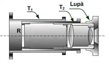 Aparatul se compune din: tubul T1 cu talpă de sprijin, tubul T2 care are un reticul R gradat (1 cm divizat în 0,1 mm) și o lupă (ocular tip Ramsden) pentru vizualizarea reticulului. Prin construcție tuburile pot să alunece unul într-altul.