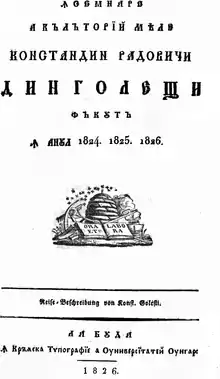 - Dinicu Golescu, Însemnare a călătoriei meale. Făcută în anul 1824. 1825. 1826. La Buda. În Crăiasca Tipografie a Universitatei Ungar. 1826 [Originalul se găsește la Biblioteca Academiei Române]