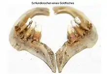 Se deosebesc dinți faringieni inferiori și dinți faringieni superiori. Dinții faringieni inferiori sunt situați pe o placa dentigeră de pe al cincilea os keratobranhial (situat pe cel de al 5-lea arc branhial). Dinții faringieni superiori sunt situați pe o placă dentigeră de pe al patrulea os faringobranhial (situat pe cel de al 4-lea arc branhial). Dinții faringieni sunt în contact cu o placă masticatoare cornoasă, ovală sau triunghiulară de pe apofiza bazioccipitalului, așa numitul os amar, care umple excavația procesului faringian al bazioccipitalului.