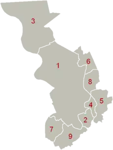 | Număr pe hartă | Nume | Suprafață (km²) | Populație (pe 3.09.2014)[3] |
