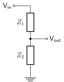 Un divizor de tensiune față de împământare este creat prin conectarea a două impedanțe electrice în serie, ca în Figura 1. Tensiunea de intrare este aplicată celor două impedanțe Z1 și Z2 iar tensiunea de ieșire este culeasă de pe Z2. Z1 și Z2 pot fi formate din orice combinație de elemente, cum ar fi rezistoare, inductoare și condensatori.
