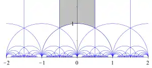 Imaginea din dreapta arată o parte din construcția domeniului fundamental pentru acțiunea grupului modular(d) Γ pe semiplanul superior H.